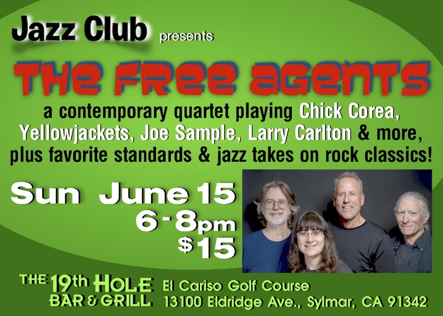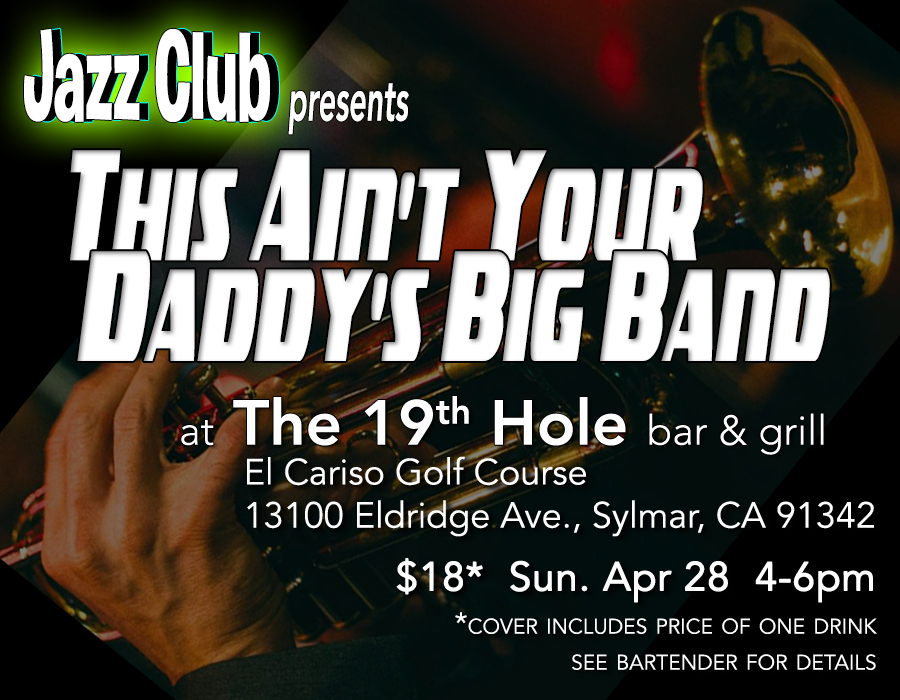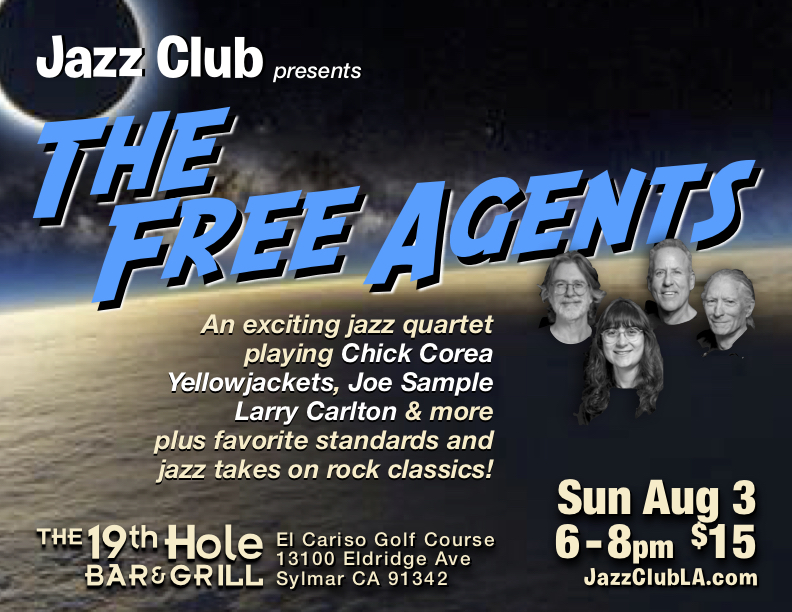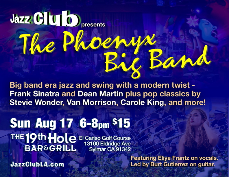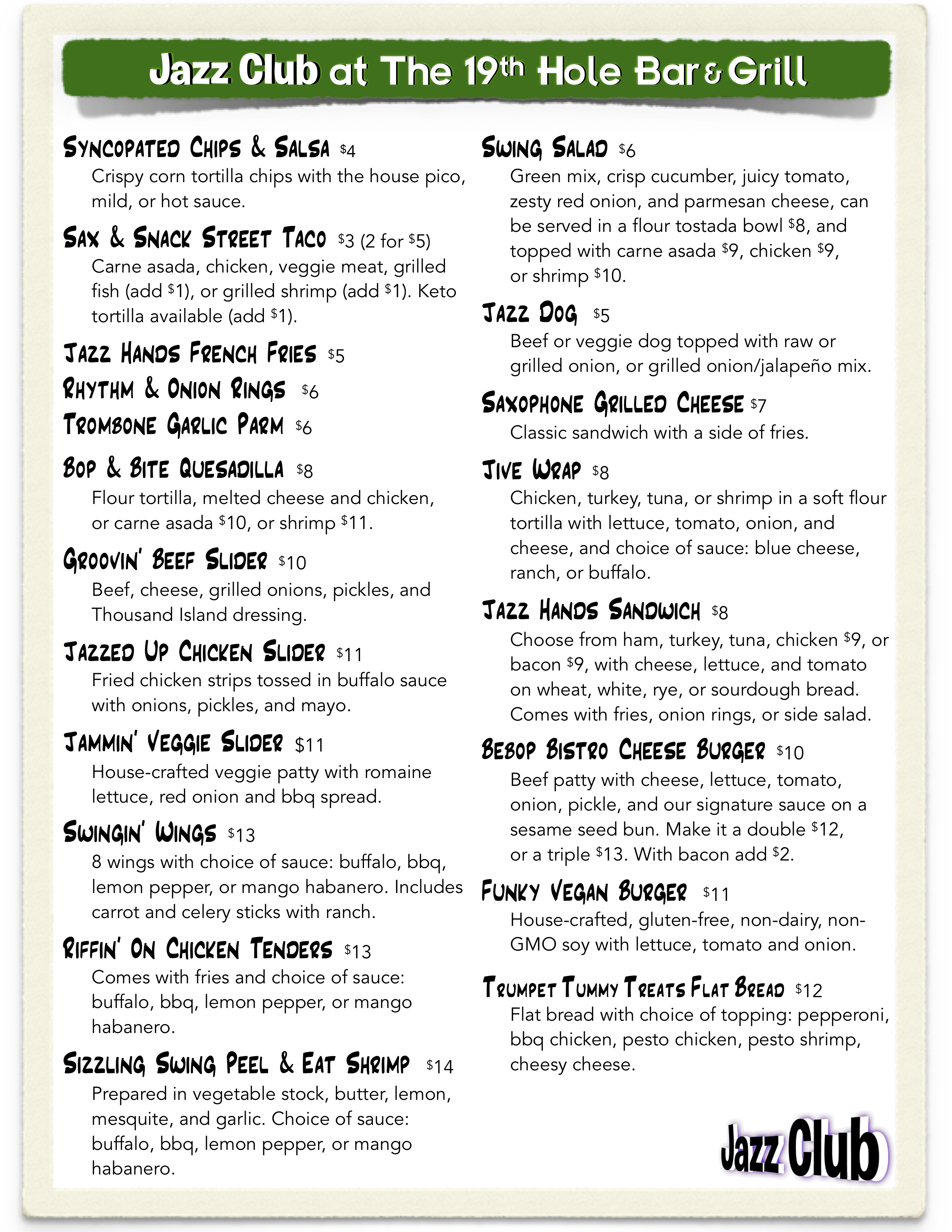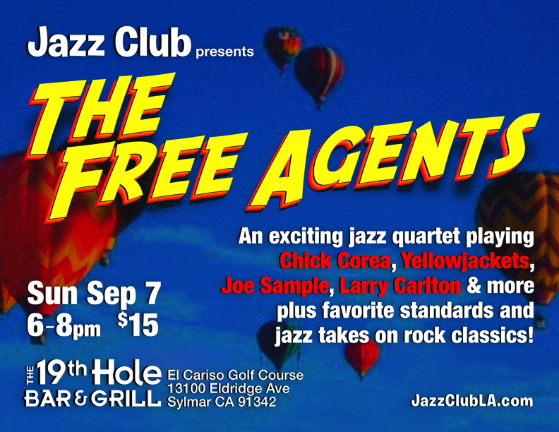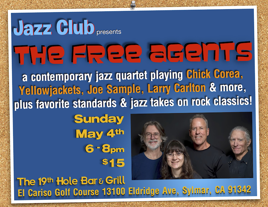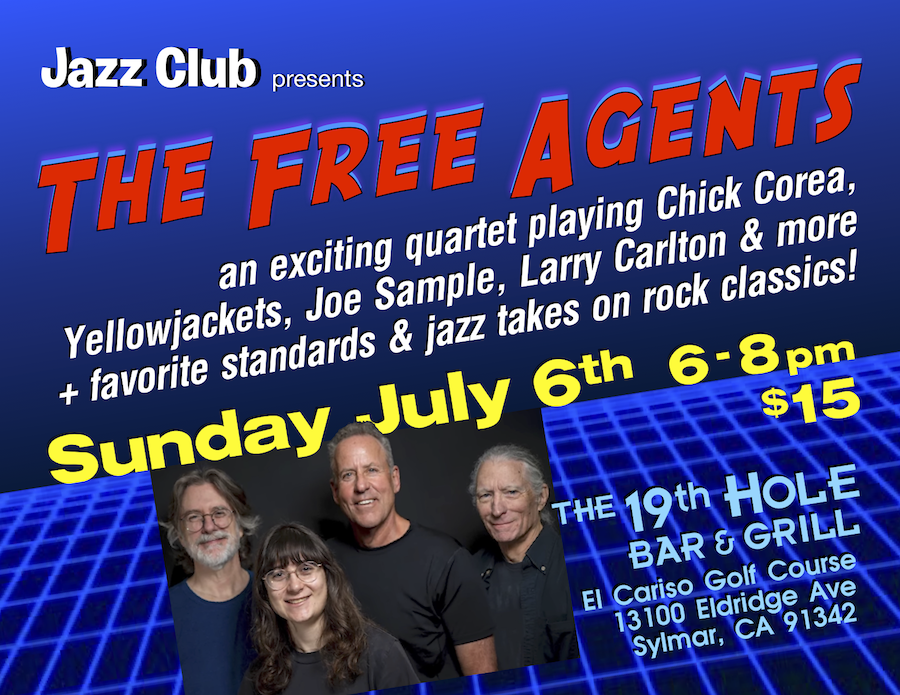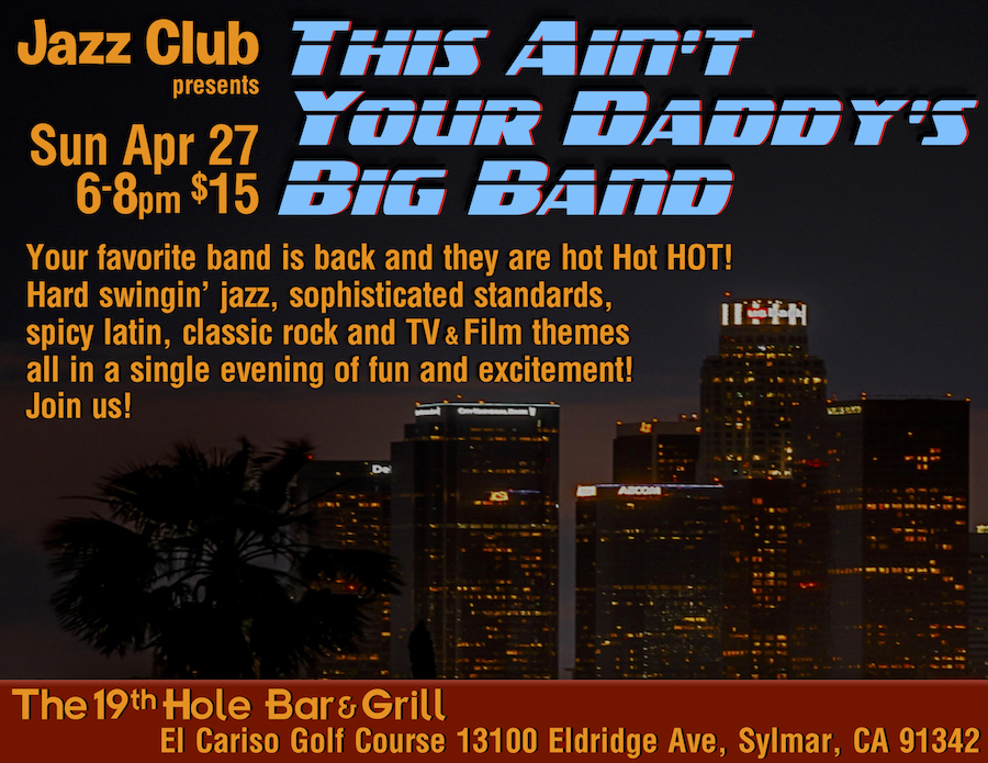 Currently, Jazz Club is appearing in the beautiful San Fernando Valley at The 19th Hole Bar & Grill where the full bar and excellent kitchen are reasonably priced, and the vibe causal. Order a beer and try the house favorite Sizzling Swing Peel & Eat Shrimp or any of the other tasty treats from the Jazz Club Menu. Reservations for groups of four or more are available. Email us.