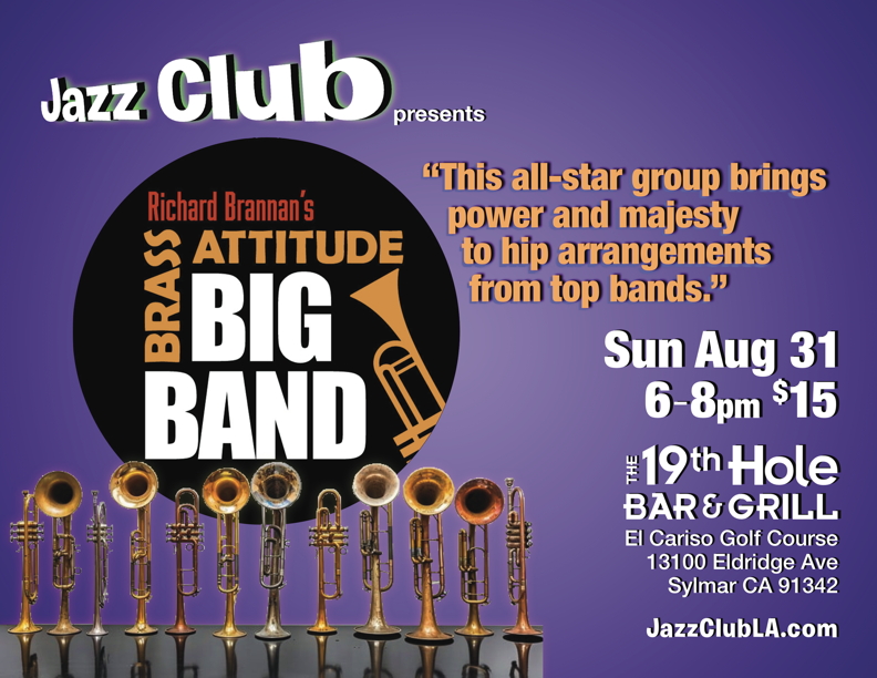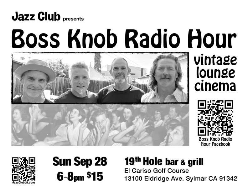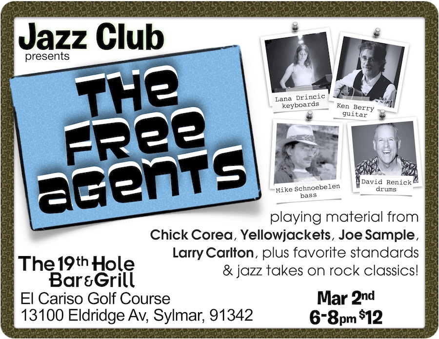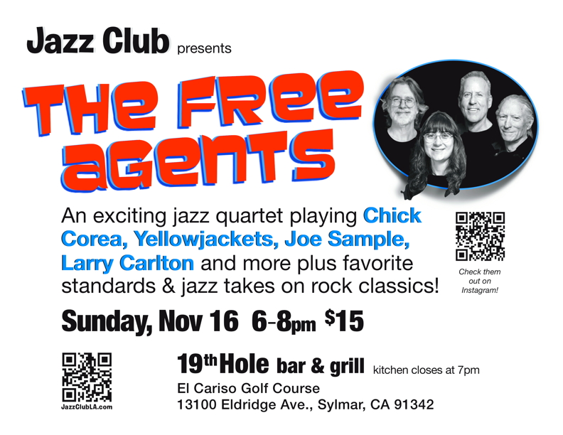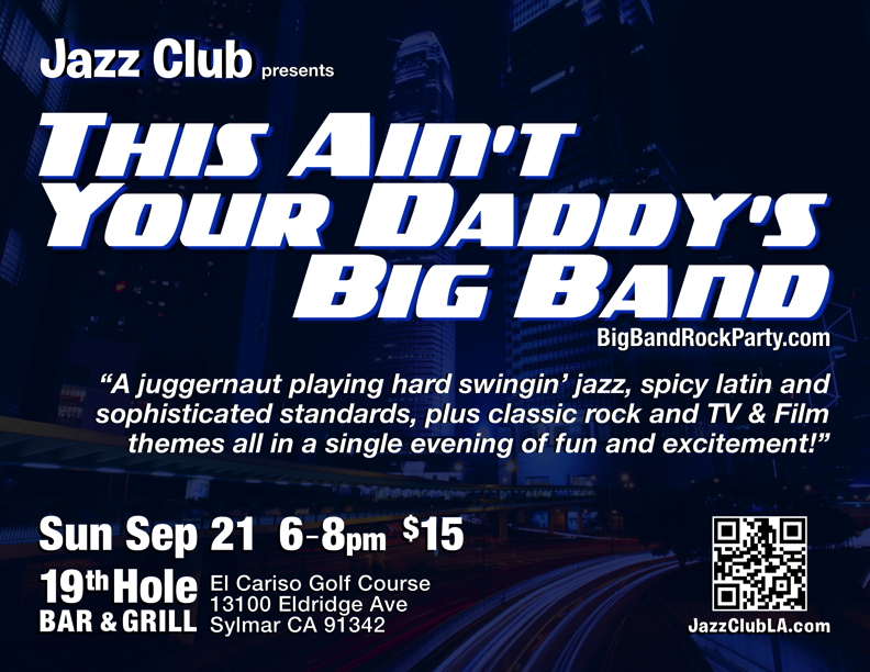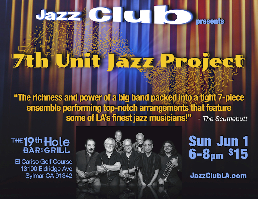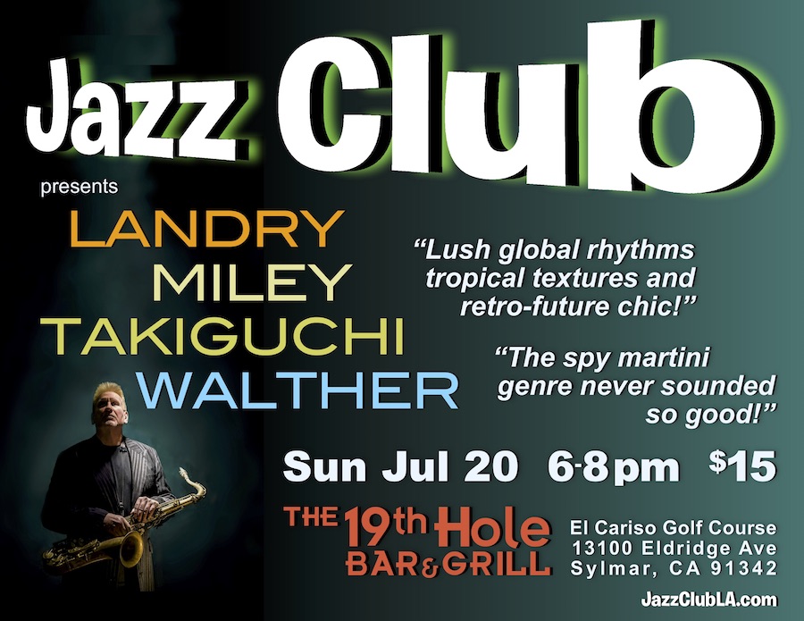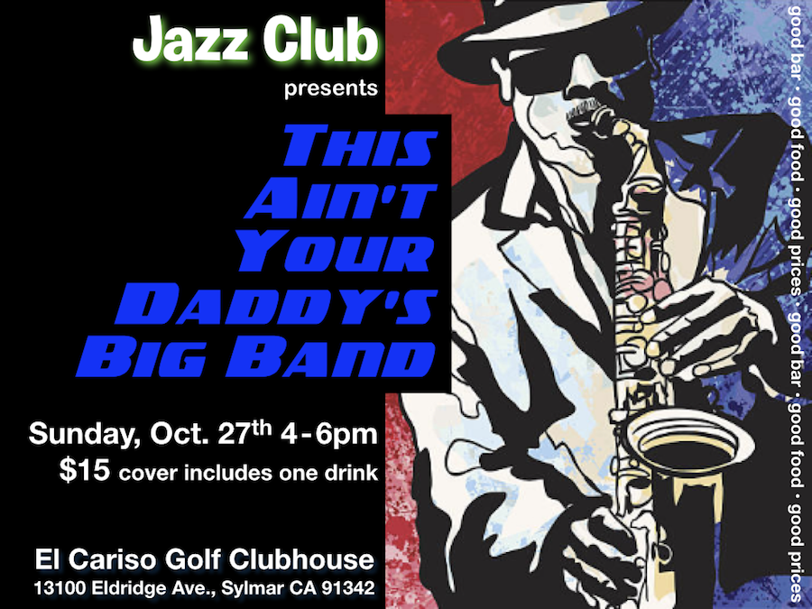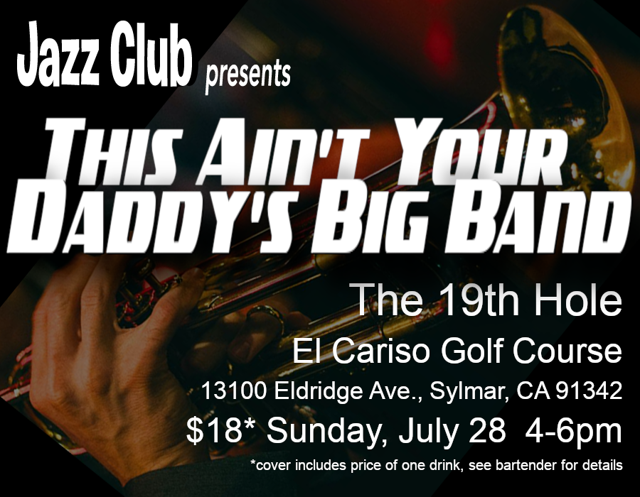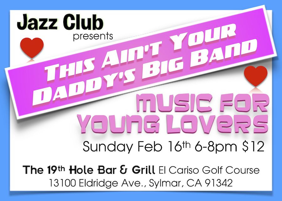 Currently, Jazz Club is appearing in the beautiful San Fernando Valley at The 19th Hole Bar & Grill where the full bar and excellent kitchen are reasonably priced, and the vibe causal. Order a beer and try the house favorite Sizzling Swing Peel & Eat Shrimp or any of the other tasty treats from the Jazz Club Menu. Reservations for groups of four or more are available. Email us.
