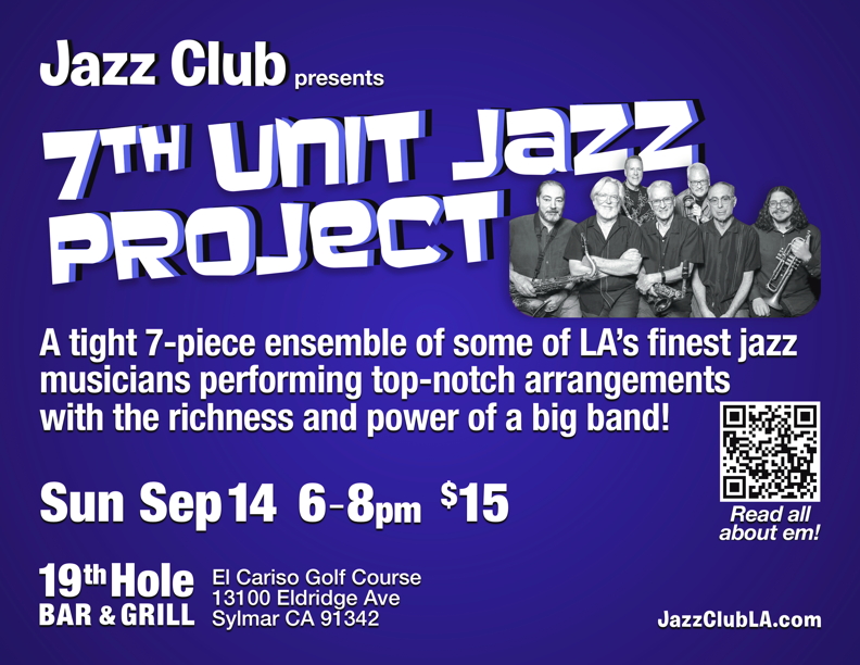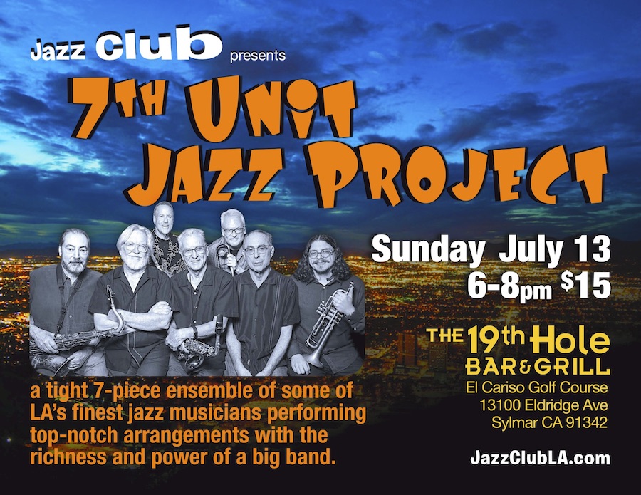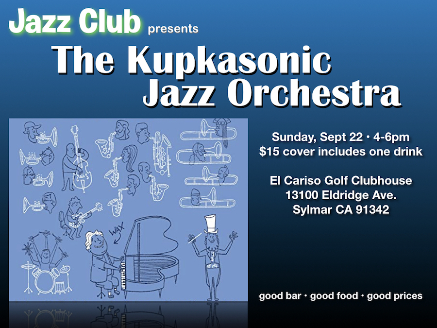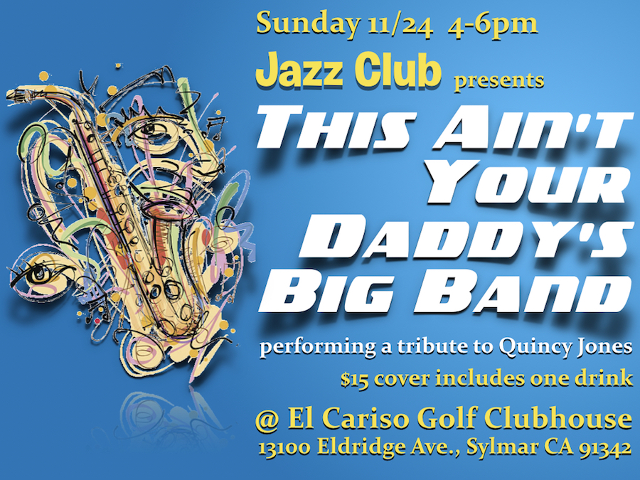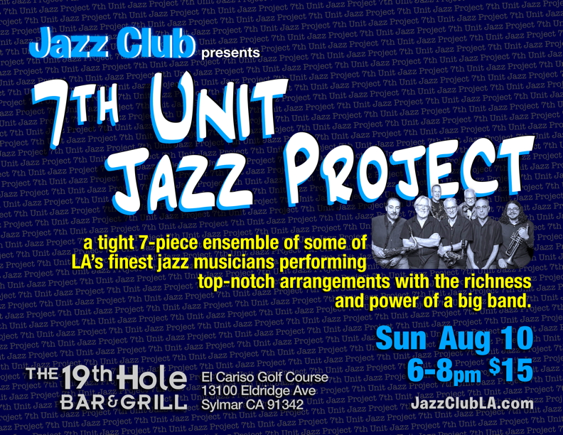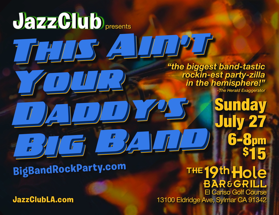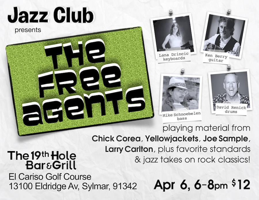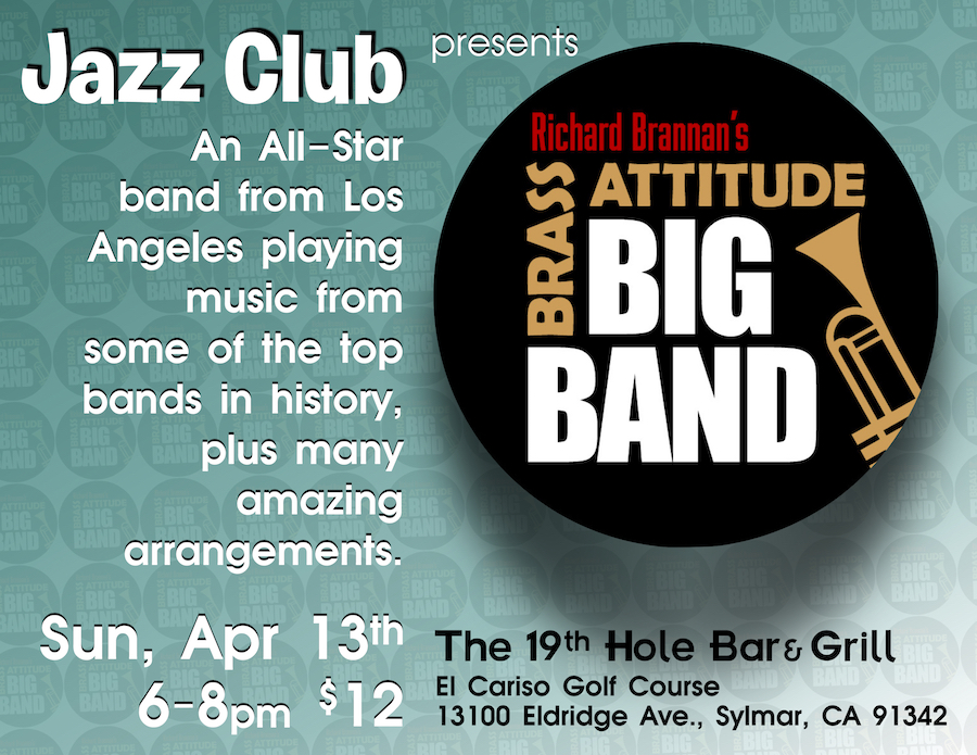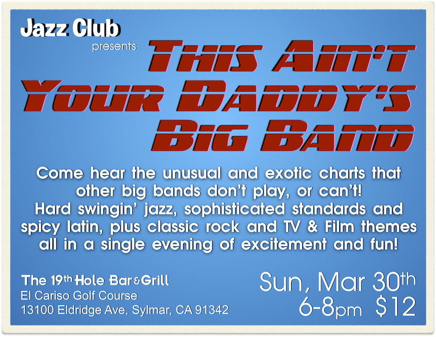 Currently, Jazz Club is appearing in the beautiful San Fernando Valley at The 19th Hole Bar & Grill where the full bar and excellent kitchen are reasonably priced, and the vibe causal. Order a beer and try the house favorite Sizzling Swing Peel & Eat Shrimp or any of the other tasty treats from the Jazz Club Menu. Reservations for groups of four or more are available. Email us.